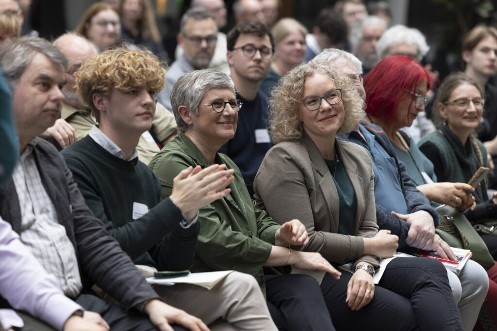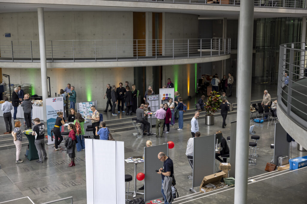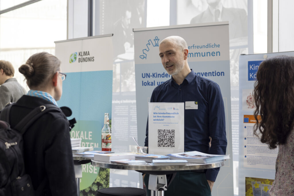 Wie Kommunen gestaltet werden können, zeigte auch der „Markt der Möglichkeiten“ mit 13 Organisationen und Initiativen eindrücklich. Im Austausch mit der Servicestelle Kommunen in der Einen Welt (SKEW), der Körber-Stiftung, dem Klima-Bündnis, Starke Demokratie e. V., der Bertelsmann Stiftung, dem Netzwerk Zukunftsorte und vielen weiteren Ausstellenden konnten Teilnehmenden konkrete Praxisbeispiele aus den Kommunen gezeigt werden. Ob grüne Stadttouren in Leipzig, die Umverteilung von Straßenraum in München oder fairer Handel als Erfolgsmodell in Langeoog – überall wird deutlich: Veränderung passiert vor Ort.