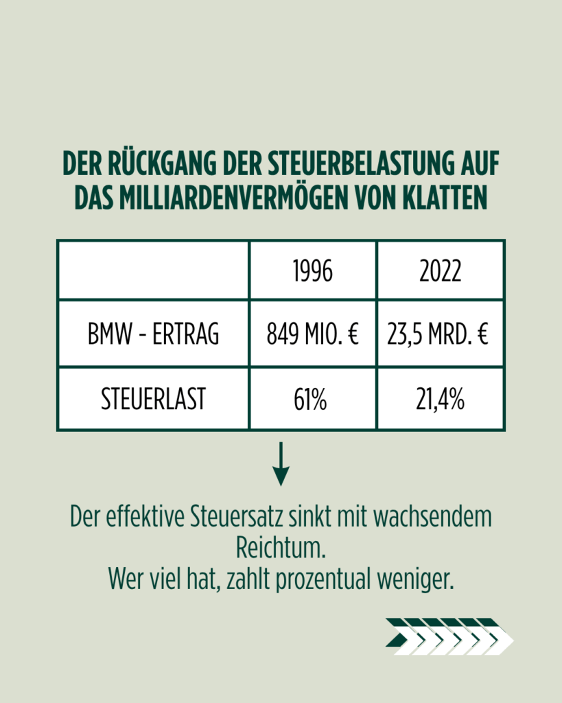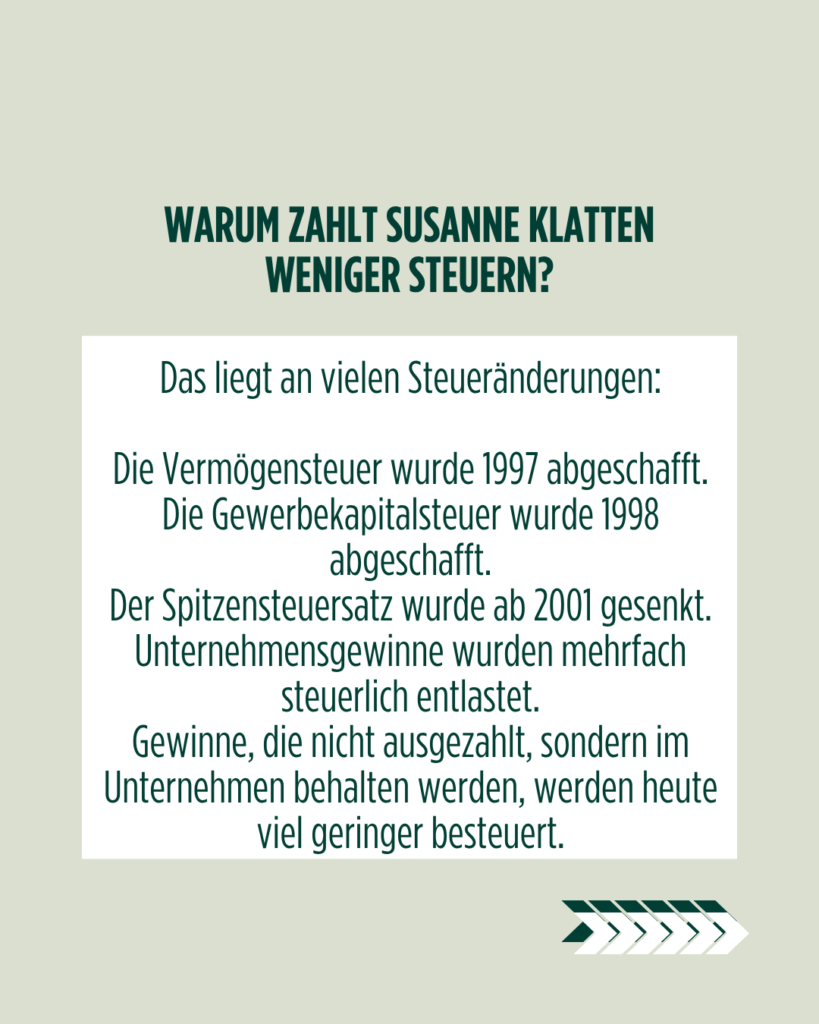💰 Genau das kommt aber nicht den Vielen, den unteren 99% zugute, sondern den Superreichen wie zum Beispiel Susanne Klatten. Die reichste Frau Deutschlands erhielt den größten Teil ihres Vermögens aus steuerfreien Schenkungen ihrer Mutter.